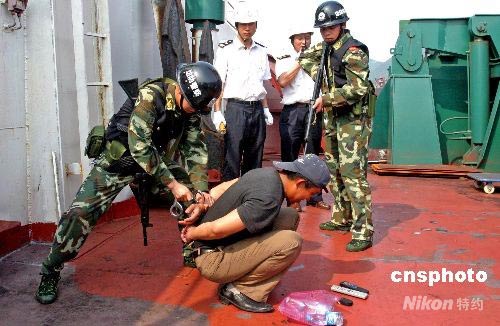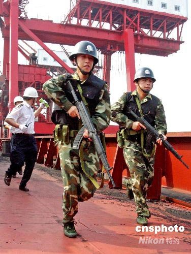 7月8日,浙江省舟山市首次舉行港口船岸反恐演習(xí),以恐怖分子搭船前往奧運(yùn)比賽項(xiàng)目城市--青島為預(yù)想,演練舟山市海事、港務(wù)、公安、邊防等部門如何確認(rèn)、搜索船上恐怖分子及排查爆炸品。此次反恐演習(xí),除了加強(qiáng)與地方公安機(jī)關(guān)溝通,建立反恐聯(lián)動(dòng)機(jī)制外,還針對(duì)船舶、港口設(shè)施的恐怖和暴力事件的犯罪活動(dòng),進(jìn)一步提高處置突發(fā)事件應(yīng)變能力,維護(hù)轄區(qū)水上人民生命財(cái)產(chǎn)安全,確保2008年北京奧運(yùn)會(huì)期間舟山海域通航安全。中新社發(fā) 黃正勝 攝