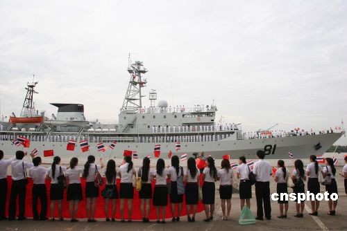 11月10日上午,泰國(guó)曼谷港口,載有400多名中國(guó)數(shù)所艦艇院校海軍官兵學(xué)員的“鄭和號(hào)”訓(xùn)練軍艦徐徐靠岸。據(jù)稱(chēng),這是中國(guó)海軍鄭和號(hào)軍艦第3次訪(fǎng)問(wèn)泰國(guó)。中國(guó)駐泰國(guó)大使館張九桓大使、安作山武官和曼谷市政府官員、泰國(guó)海軍軍官學(xué)校代表、海軍外事處軍官以及泰國(guó)華人華僑、留學(xué)生代表100多人歡聚曼谷港口,熱情迎接中國(guó)海軍鄭和號(hào)訓(xùn)練軍艦再度訪(fǎng)泰。中新社發(fā) 顧時(shí)宏 攝