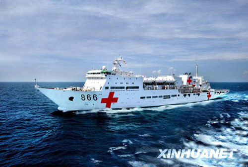 2008年12月22日,浙江舟山,我國自主設(shè)計、建造的首艘大型專業(yè)醫(yī)院船,也是世界上第一艘大型專業(yè)醫(yī)院船---866岱山島船命名授旗,開始在海軍服役。