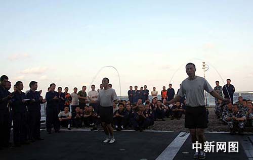 中新網(wǎng)“?凇迸1月10日電 當?shù)貢r間1月10日下午,正在亞丁灣海域執(zhí)行護航任務的“?凇碧枌楎(qū)逐艦繼續(xù)舉行甲板運動會,參賽官兵參加跳繩項目比賽。