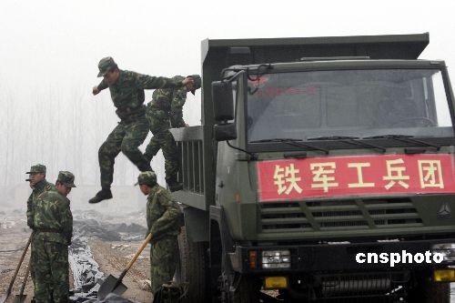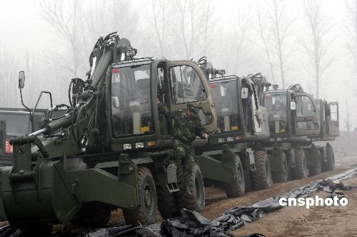 2月7日,鐵軍官兵在黃河岸邊進(jìn)行導(dǎo)流渠開(kāi)挖施工前的準(zhǔn)備工作。當(dāng)日濟(jì)南軍區(qū)鐵軍工兵團(tuán)200多名官兵攜99臺(tái)工程裝備開(kāi)進(jìn)河南封丘黃河岸邊,開(kāi)始搶挖抗旱導(dǎo)流渠。這條導(dǎo)流渠長(zhǎng)約2300米,約需5天時(shí)間開(kāi)挖完畢。黃河水經(jīng)此導(dǎo)流渠進(jìn)入當(dāng)?shù)毓喔惹,將?duì)黃河以北的河南新鄉(xiāng)市、安陽(yáng)市等灌區(qū)的265萬(wàn)畝進(jìn)行灌溉,以解大旱之急。中新社發(fā) 張曉理 攝