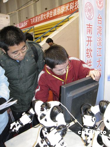 11月15日,第十屆“挑戰(zhàn)杯”飛利浦全國大學(xué)生課外學(xué)術(shù)科技作品競賽決賽在南開大學(xué)開幕。在學(xué)生科技作品展示環(huán)節(jié)中,由南開大學(xué)與臺(tái)灣淡江大學(xué)合作研發(fā)的“mychannel虛擬電視臺(tái)”和“桌面機(jī)器人輔助多模即時(shí)交流平臺(tái)”格外引人關(guān)注。淡江大學(xué)參賽隊(duì)指導(dǎo)教師蕭瑞祥介紹:“從決定合作到作品完成,經(jīng)歷了將近一年時(shí)間。中新社發(fā) 田齊 攝