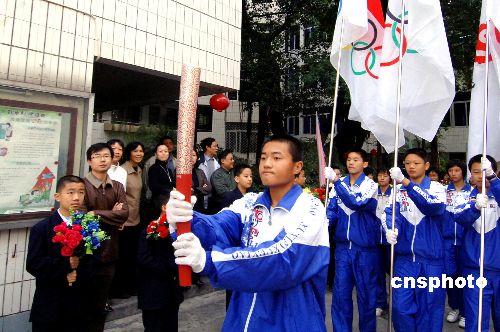 十一月二十二日,一名手持北京奧運(yùn)會(huì)“祥云”火炬的中學(xué)生火炬手步入福州第十九中學(xué)校園。當(dāng)日距北京奧運(yùn)會(huì)開(kāi)幕還有二百六十天,由國(guó)際奧委會(huì)奧林匹克珍藏品中國(guó)巡展組委會(huì)主辦的北京奧運(yùn)會(huì)“祥云”火炬進(jìn)福州校園活動(dòng)在福州實(shí)驗(yàn)小學(xué)、福州第十九中學(xué)校園舉行。中新社發(fā) 劉可耕 攝