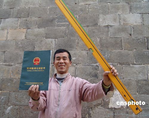 12月8日,程成高在展示他發(fā)明的“帶抹砂漿機(jī)構(gòu)的水平尺”。江西省樂(lè)平市后港鎮(zhèn)程家村農(nóng)民程成高,只有小學(xué)三年級(jí)文化,但他憑借自己的勤奮和智慧,克服困難,用4年的時(shí)間,發(fā)明了集抹砂漿與測(cè)量水平與一身的“帶抹砂漿機(jī)構(gòu)的水平尺”,并獲得了國(guó)家實(shí)用新型專(zhuān)利證書(shū),成為當(dāng)?shù)剞r(nóng)民的典范。另外,他的又一項(xiàng)發(fā)明“滾輪式清掃畚箕”正在申請(qǐng)專(zhuān)利中。中新社發(fā) 石衛(wèi)明 攝