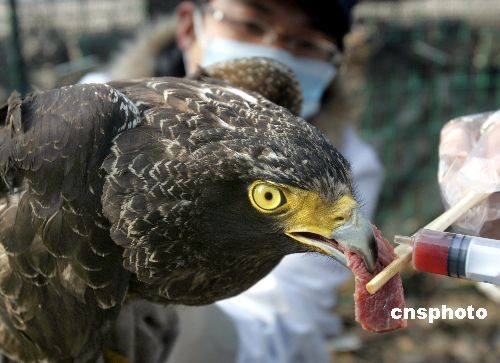 2月27日下午,浙江蒼南“綠眼睛”野生動物救助站,志愿者正照顧一只受傷的珍稀動物蛇雕。這只蛇雕是在浙江永嘉嶺頭鄉(xiāng)被發(fā)現(xiàn)的,送到救助站已有3天,它身長約70厘米,兩翅展開約1.5米,體重1.6公斤。待它身體狀態(tài)恢復(fù)后,將會被放歸大自然。
