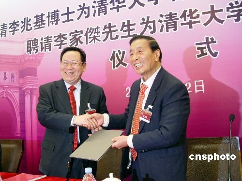 圖為在受聘儀式上,清華大學(xué)校長(zhǎng)顧秉林院士(左)親手為李兆基頒發(fā)聘書。