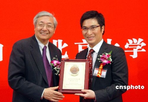 圖為北京大學(xué)校長許智宏向李家誠(右)頒發(fā)名譽(yù)校董紀(jì)念牌。