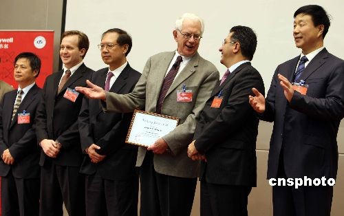 四月九日,全球500強(qiáng)、世界領(lǐng)先的多元化高科技制造企業(yè)霍尼韋爾公司攜手北京航空航天大學(xué),共同拉開(kāi)2008年霍尼韋爾—諾貝爾全球校園行的序幕。諾貝爾物理獎(jiǎng)獲得者謝爾登·格拉肖博士(右三)親臨現(xiàn)場(chǎng)為學(xué)子們講授了他的學(xué)術(shù)成果和科研心得,與學(xué)生們進(jìn)行了面對(duì)面的交流;裟犴f爾—諾貝爾全球校園行活動(dòng)由霍尼韋爾公司發(fā)起,旨在全球范圍內(nèi)提升高校科學(xué)教育、培養(yǎng)高素質(zhì)科技創(chuàng)新人才的社會(huì)公益活動(dòng)。中新社發(fā) 任海霞 攝