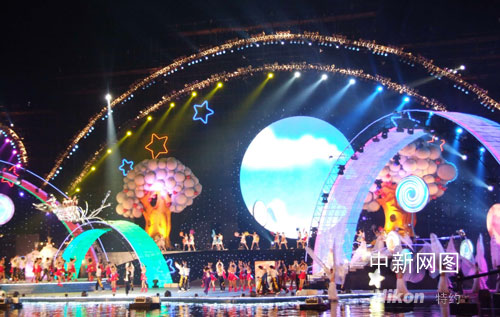第四屆中國(guó)國(guó)際動(dòng)漫節(jié)開幕式晚會(huì)現(xiàn)場(chǎng),晚會(huì)由“心”、“情”、“夢(mèng)”三個(gè)篇章組成,充分體現(xiàn)了“多彩動(dòng)漫品質(zhì)生活”的主題。 周翌 攝