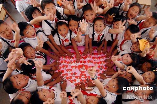 2008年5月30日,來自四川綿陽地震災(zāi)區(qū)、在日照市經(jīng)濟(jì)開發(fā)區(qū)第二小學(xué)上學(xué)的3名學(xué)生,在新學(xué)校與老師同學(xué)們歡慶“六一”兒童節(jié)。日照經(jīng)濟(jì)開發(fā)區(qū)第二小學(xué)的師生為3名同學(xué)送上精美禮物,祝福他們和四川地震災(zāi)區(qū)的小朋友節(jié)日快樂。近日,山東日照市教育部門安排3名投奔親友的四川地震災(zāi)區(qū)小學(xué)生就近在日照經(jīng)濟(jì)開發(fā)區(qū)二小上學(xué),學(xué)校為這3名學(xué)生捐贈了學(xué)習(xí)用品,并減免費(fèi)用。中新社發(fā) 陳為峰 攝