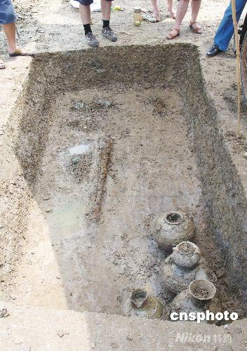 2008年7月24日,蘇州博物館考古工作者對(duì)蘇州相城區(qū)古宮黃泥村的一座西漢古墓進(jìn)行發(fā)掘,該古墓出土了一批墓葬品,共有3組6件,包括青銅鏡、陶壺、陶瓿和陶罐以及釉陶,都是兩個(gè)一對(duì)的組合,不僅器形較大,釉色更好,而且保存完好。據(jù)了解,該墓葬長(zhǎng)3.15米,寬1.60米,被確定為西漢時(shí)期,墓葬規(guī)模以及隨葬品都超過以往發(fā)現(xiàn)的同年代墓葬,具有一定的價(jià)值。中新社發(fā) 朱子寒 攝