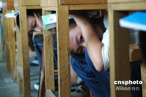 9月16日,山東臨沭縣臨沭鎮(zhèn)中心中學(xué)的學(xué)生在該縣武裝部工作人員指導(dǎo)下進(jìn)行防空襲逃生演練。中新社發(fā) 呂永國 攝