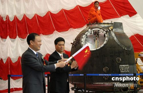 圖為工作人員從返回艙中取出“神七”出艙航天員翟志剛在外太空揮舞的五星紅旗。
