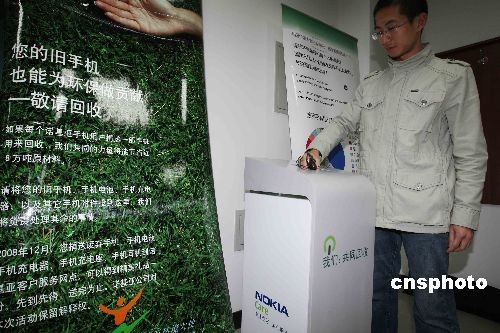 圖為大學(xué)生將手機(jī)等廢舊用品投入環(huán)!熬G箱子”。