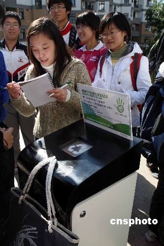 10月31日晚,由某環(huán)保企業(yè)率先發(fā)起的環(huán)保“綠箱子”進(jìn)校園活動在中國傳媒大學(xué)、清華大學(xué)正式展開,此次活動的目的在于喚起全民族的環(huán)保意識,讓每一位公民都為環(huán)保事業(yè)做力所能及的事情。中新社發(fā) 任海霞 攝
