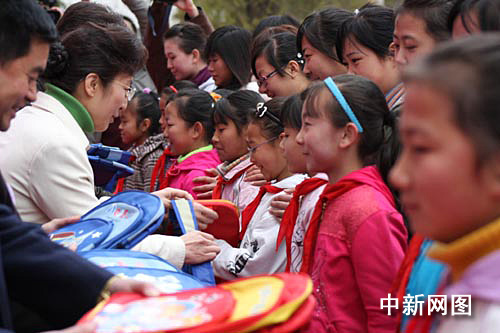 甘肅省人口委、共青團(tuán)甘肅省委、蘭州市政府官員為結(jié)對(duì)幫教的女大學(xué)生志愿者頒發(fā)證書,為女童贈(zèng)送書包等。