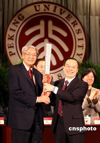 11月14日下午,周其鳳(右)接替許智宏出任北京大學(xué)校長。卸任后的許智宏(左)將自己的奧運(yùn)會(huì)火炬捐贈(zèng)給北京大學(xué),并親手轉(zhuǎn)交給自己的繼任者周其鳳。中新社發(fā) 王天天 攝