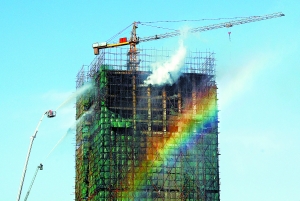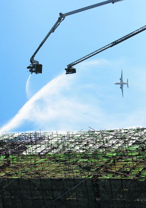 下午3時(shí),站在該樓西南側(cè)的日新路上能看到,全樓16層至20層外圍腳手架上的綠色防塵罩已在大火中化為灰燼。盡管兩條水柱正從離地60余米高的云梯上朝著樓內(nèi)猛烈噴射,但是由于風(fēng)大吹歪了水柱,高空的水霧甚至在晴空下形成了兩道彩色長(zhǎng)虹。