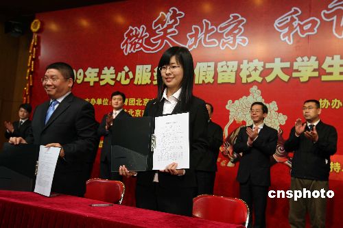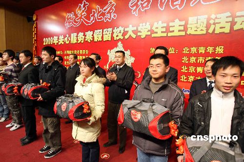 一月十日,北京啟動“微笑北京 和諧社會”關(guān)心服務(wù)寒假留校大學(xué)生主題活動,其主要內(nèi)容包括關(guān)心地震災(zāi)區(qū)、邊遠(yuǎn)地區(qū)和經(jīng)濟困難大學(xué)生,提供見習(xí)崗位,幫助同學(xué)們利用寒假進行就業(yè)創(chuàng)業(yè)見習(xí)。為留校學(xué)生贈送兩千個愛心大禮包。中新社發(fā) 任海霞 攝