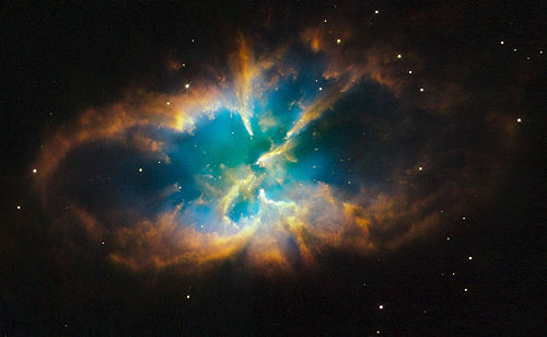 據(jù)美國(guó)每日太空網(wǎng)報(bào)道,哈勃太空望遠(yuǎn)鏡日前拍攝到銀河系內(nèi)一個(gè)罕見(jiàn)的美麗行星狀星云NGC2818,它隱藏在一個(gè)距離地球1萬(wàn)光年羅盤(pán)星座的恒星團(tuán)內(nèi)部。這張精美的圖片是由哈勃太空望遠(yuǎn)鏡廣角行星2號(hào)相機(jī)于2008年11月份拍攝的,其彩色部分分別代表著該星云的噴射釋放物質(zhì),它們共同組成細(xì)絲狀漩渦結(jié)構(gòu),其中紅色部分代表氮?dú)、綠色部分代表氫氣、藍(lán)色部分代表氧氣。