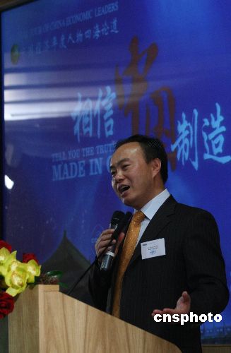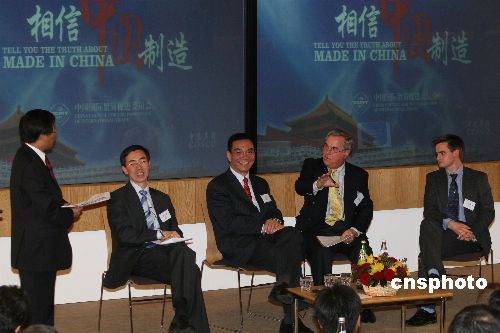 圖為英國(guó)諾丁漢大學(xué)教授姚樹(shù)潔 、中國(guó)駐英使館政治參贊劉為民、北京大學(xué)中國(guó)經(jīng)濟(jì)研究中心主任林毅夫、英中貿(mào)易協(xié)會(huì)主席白樂(lè)威和英國(guó)諾丁漢大學(xué)講師薩瑟蘭(自左至右)就“中國(guó)制造”的話(huà)題進(jìn)行討論。