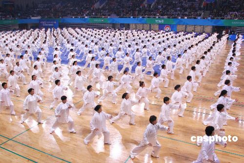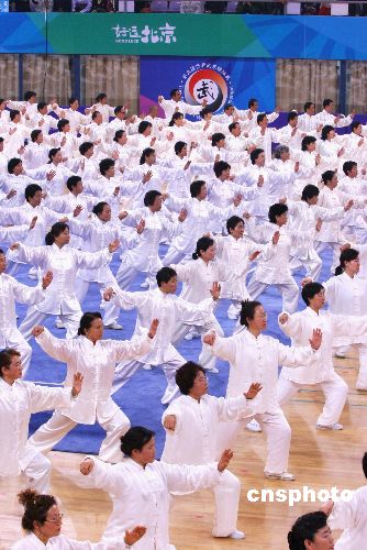 11月11日,千名北京市民在“好運北京”第九屆世界武術(shù)錦標賽開幕式上同打太極拳。中新社發(fā) 富田 攝