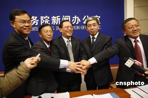 11月26日下午,繞月探測(cè)工程領(lǐng)導(dǎo)小組副組長(zhǎng)、國(guó)防科工委副主任、航天局局長(zhǎng)孫來(lái)燕(中),繞月探測(cè)工程測(cè)控系統(tǒng)副總指揮、北京航天飛行控制中心主任朱民才(左二),繞月探測(cè)工程副總指揮、航天科技集團(tuán)公司副總經(jīng)理雷凡培(右二),中國(guó)科學(xué)院空間科學(xué)與應(yīng)用中心主任吳季(右)以及國(guó)新辦新聞局副局長(zhǎng)華清(左),在國(guó)務(wù)院新聞辦公室舉行的新聞發(fā)布會(huì)上,共同慶祝中國(guó)首次月球探測(cè)工程的圓滿(mǎn)成功。當(dāng)日,國(guó)務(wù)院新聞辦公室邀請(qǐng)中國(guó)繞月探測(cè)工程領(lǐng)導(dǎo)小組副組長(zhǎng)、國(guó)防科工委副主任、國(guó)家航天局局長(zhǎng)孫來(lái)燕等介紹中國(guó)首次月球探測(cè)工程等方面情況,并答記者問(wèn)。中新社發(fā) 杜洋 攝