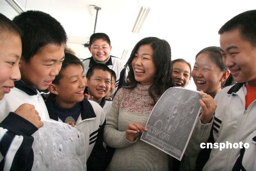 11月27日,威海古寨中學(xué)的學(xué)生上網(wǎng)查看“嫦娥一號”衛(wèi)星傳回的第一幅月面圖像。當(dāng)日,威海一中學(xué)開展“學(xué)科技激發(fā)航天熱”活動,同學(xué)們通過上網(wǎng)查看、老師講解、小組討論等形式了解“嫦娥一號”衛(wèi)星及其相關(guān)的天文知識。中新社發(fā) 海云飛 攝