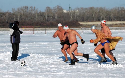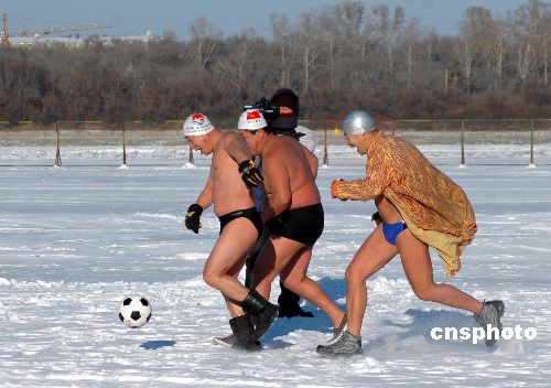 12月23日,50余名中俄邊城的冬泳愛好者在黑龍江上進行冬泳和足球比賽,用挑戰(zhàn)自我的方式迎接新年的到來。中新社發(fā) 邱齊龍 攝