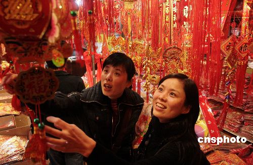 十二月三十一日,為了迎接新年,福建泉州購(gòu)買喜慶用品的市民絡(luò)繹不絕,市場(chǎng)熱鬧非凡!氨瘛睊旒、彩燈、“中國(guó)結(jié)”等的銷售異;鸨壹覒魬舳紝⒆约依锢锿馔庋b點(diǎn)一新迎接新年。中新社發(fā) 傅丹丹 攝