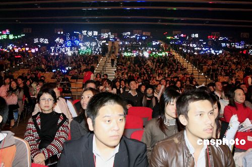 各歌星“粉絲”們現(xiàn)場(chǎng)用熒光棒聲援自己崇拜的對(duì)象,互斗聲勢(shì),形成一景。