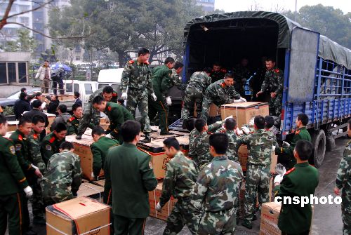 2月4日,雪凝天氣尚未結(jié)束,貴陽地區(qū)又飄起了毛毛細(xì)雨,在省政府廣場上,武警戰(zhàn)士在裝運重慶等省市支援貴州的救災(zāi)物資和小型發(fā)電機,準(zhǔn)備運往此次雪災(zāi)中受災(zāi)嚴(yán)重的黔東南、黔南、銅仁、畢節(jié)等地區(qū)。此次持續(xù)20多天的雪凝凌凍天氣,使貴州省70多個縣市受災(zāi)嚴(yán)重,部分縣市停水?dāng)嚯娨呀?0天。中新社發(fā) 歐陽昌佩 攝