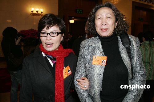 三月三日,在全國政協(xié)新委員名單上令人誤認(rèn)為是演藝明星范冰冰的俄語專家范冰冰(右)露真容,與中央電視臺新聞播音員李瑞英攜手進(jìn)入北京人民大會堂,出席全國政協(xié)十一屆一次會議開幕會。范冰冰委員身高近一米七二,能說一口流利俄語,是中國國際廣播電臺俄語部主任、首席播音員。中新社發(fā) 潘索菲 攝