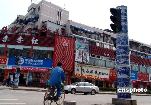 3月20日,“清明上河圖”瓷器紅綠燈亮相景德鎮(zhèn)市街頭。該燈為白底青花圖案,畫面內(nèi)容是清明上河圖,直徑0.5米,高4.2米。樹立在在景德鎮(zhèn)新廠的瓷器紅綠燈不但能指揮交通,美化城市,同時(shí)正逐漸成為景德鎮(zhèn)鮮明的瓷文化標(biāo)志符號之一。中新社發(fā) 石衛(wèi)明 攝