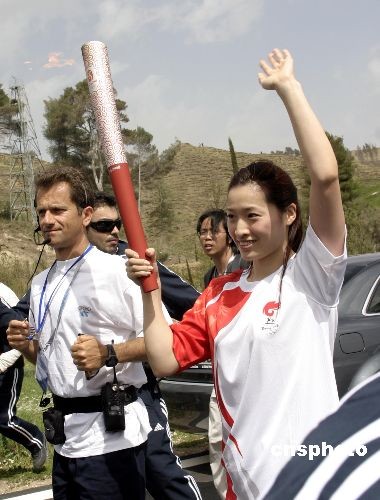 希臘當?shù)貢r間3月24日,北京二00八年奧運會圣火采集儀式在古奧林匹亞競技場舉行,隨后火炬希臘傳遞開始。第一位中國火炬手羅雪娟一邊傳遞圣火一邊向觀眾揮手致意。中新社發(fā) 王歡 攝