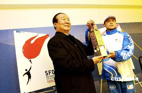 圖為北京奧組委執(zhí)行副主席蔣效愚和圣火護(hù)衛(wèi)員共舉圣火燈。作者: 陳鋼