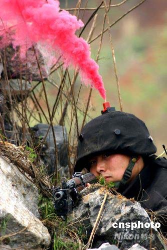 4月16日,武警武漢指揮學院學員在野外進行戰(zhàn)術演練。為使演練更加貼近實際,學院將實兵對抗模擬系統(tǒng)用于演練,進一步增強了戰(zhàn)斗的真實性,對錘煉學員的戰(zhàn)術意識、戰(zhàn)術動作、作戰(zhàn)指揮將起到有力的促進作用 。在演練中,雙方學員身著作戰(zhàn)服及頭盔,一旦被擊中,服飾將發(fā)出語音警示或散發(fā)煙霧,且武器自行關閉、不能射擊,類似實戰(zhàn)“死亡”,以達到退出演練的效果。中新社發(fā) 傳榮 攝