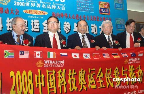 2008年4月20日,為了表達(dá)海內(nèi)外華人心連心全力支持北京奧運(yùn)會(huì)的共同心愿,發(fā)揚(yáng)科技奧運(yùn)全民參與精神、提高科技奧運(yùn)全民參與意識(shí),由世界著名品牌大會(huì)主辦機(jī)構(gòu)美中經(jīng)貿(mào)投資總商會(huì)、世界品牌組織、全美在線文化傳媒等華商機(jī)構(gòu)聯(lián)合主辦的“2008中國(guó)科技奧運(yùn)全民參與推動(dòng)大會(huì)”,在北京人民大會(huì)堂隆重舉行,全國(guó)政協(xié)副主席阿不來提·阿不都熱西提(左三)出席大會(huì)。圖為阿不來提與美中經(jīng)貿(mào)投資總商會(huì)會(huì)長(zhǎng)、世界著名品牌大會(huì)主席周茳釤鈞(左二)及領(lǐng)導(dǎo)人與嘉賓共同舉行“2008中國(guó)科技奧運(yùn)全民參與推動(dòng)大會(huì)”推動(dòng)儀式。周茳釤鈞呼吁:海內(nèi)外華人團(tuán)結(jié)起來,為北京奧運(yùn)會(huì)的成功舉辦獻(xiàn)計(jì)獻(xiàn)策,發(fā)揮優(yōu)勢(shì),奉獻(xiàn)力量。 作者: 鄒憲