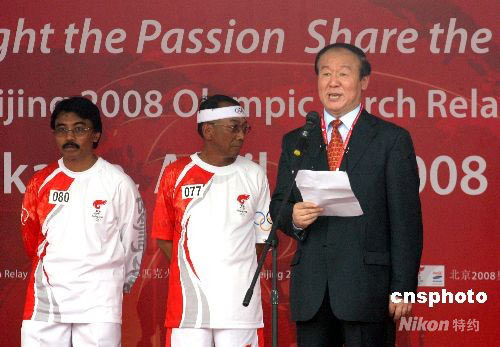 4月22日下午3時(shí)30分,印尼青體部部長阿迪亞克薩·道爾特用手中的“祥云”火炬點(diǎn)燃圣火盆,北京奧運(yùn)圣火在雅加達(dá)的傳遞順利結(jié)束。北京奧運(yùn)圣火雅加達(dá)站傳遞從蘇加諾體育中心東門開始后,八十名火炬手圍繞其中的蘇加諾體育場進(jìn)行七公里左右的傳遞。八十位火炬手中,有印尼現(xiàn)役和退役優(yōu)秀運(yùn)動(dòng)員、贊助商代表、政府官員、社會(huì)活動(dòng)家等。21日晚10時(shí),北京奧運(yùn)圣火將離開雅加達(dá),前往下一站——澳大利亞的堪培拉。圖為北京奧組委執(zhí)行副主席蔣效愚(右)在慶典儀式上致辭。中新社發(fā) 沈晨 攝