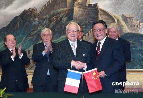 4月25日,全國人大常委會委員長吳邦國在北京人民大會堂與法國參議院議長蓬斯萊舉行會談。會后雙方簽署了中華人民共和國全國人民代表大會與法蘭西共和國參議院建立定期交流機(jī)制的協(xié)議。中新社發(fā) 廖文靜 攝