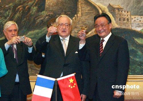 蓬斯萊在會(huì)后的簽字儀式上高舉酒杯用法文高呼:為中法友誼干杯。中新社發(fā) 廖文靜 攝