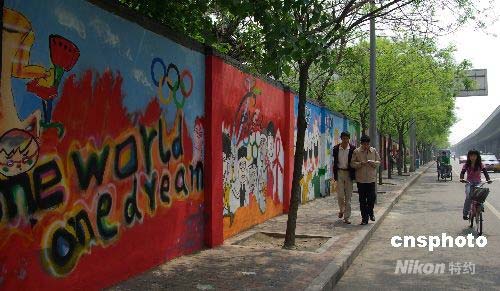 4月28日,北京第一面奧運(yùn)文化墻亮相北京理工大學(xué)西校墻,這是市民用五顏六色的顏料和噴漆材料,在長(zhǎng)約600米、高2米多的墻上,勾畫(huà)出70多幅個(gè)性鮮明、充滿奧運(yùn)元素的涂鴉作品。作為北京市民參與奧運(yùn)環(huán)境建設(shè)的重要標(biāo)志,北京將在七城區(qū)繁華地段和高校周邊設(shè)立10面奧運(yùn)文化墻。 中新社發(fā) 九州 攝