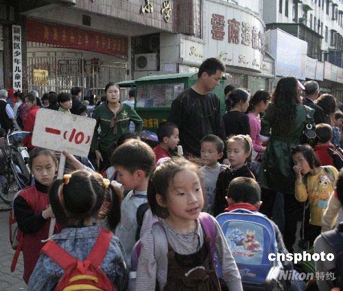 四月二十八日下午,阜陽市清河路小學一年級學生在排隊放學。安徽省阜陽市千余嬰幼兒童感染腸道病毒EV71后,當?shù)卣扇〈胧┘訌娋戎,嚴守預防,減少擴延。中新社發(fā) 張婭子 攝