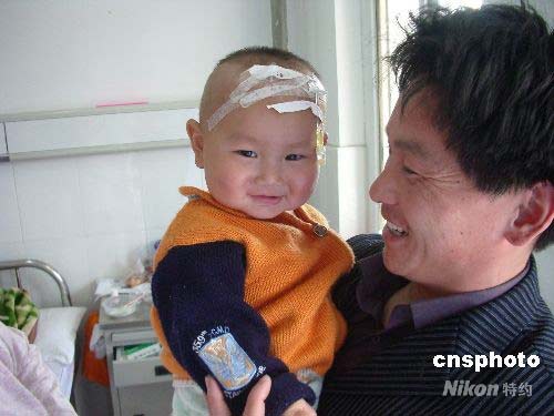 4月29日,阜陽市第二人民醫(yī)院,家長抱著已脫離生命危險的患兒在病房內(nèi)笑逐顏開。家住安徽省阜陽市潁泉區(qū)蘇屯鄉(xiāng)孟寨大隊1歲患兒劉暢,4月17日因發(fā)熱伴手足皮疹入住該醫(yī)院,當(dāng)時病情很嚴重,經(jīng)醫(yī)院專家會診調(diào)整治療方案,目前病情穩(wěn)定。4月29日上午,安徽省衛(wèi)生廳副廳長杜昌智在通報會上說,目前阜陽共報告腸道病毒EV71感染病例1520例,其中痊愈585例,經(jīng)全力搶救無效死亡20例,仍在住院治療412例,其中重癥患者26例。中新社發(fā) 張婭子 攝