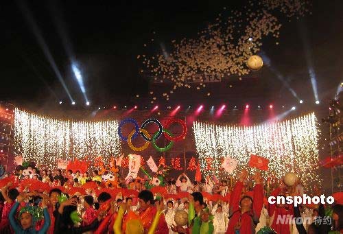 演員和觀眾振臂歡呼,臺上臺下焰火輝映,共同期待一百天后的北京奧運盛會。 中新社發(fā) 潘海濤 攝