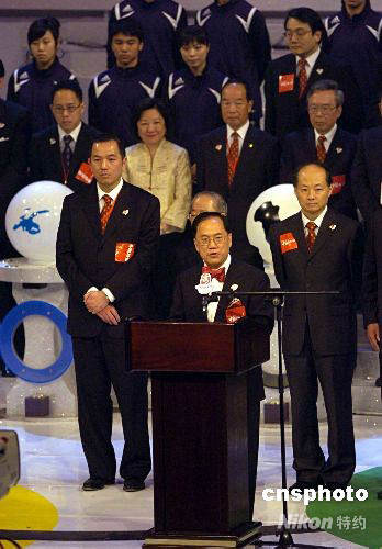 曾蔭權(quán)在“北京奧運(yùn)倒數(shù)一百天”晚會(huì)上致詞。中新社發(fā) 譚達(dá)明 攝