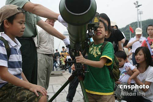 圖為市民在昂船洲軍營(yíng)近距離觸摸輕武器。中新社發(fā) 武仲林 攝