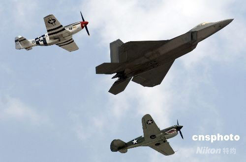 當?shù)貢r間5月4日,一架美軍最先進的F-22猛禽戰(zhàn)機(中)與二戰(zhàn)時期的美軍戰(zhàn)機P-51和P-40空中共舞,讓人們體驗航空科技的突飛猛進。當天,位于美國南加州河濱縣的一個美國空軍預(yù)備基地舉行規(guī)模盛大的航空展和飛行表演。C-17A全球霸王運輸機、C-5銀河運輸機等空中巨無霸和F-22猛禽戰(zhàn)機等美軍先進軍用飛機亮相展覽,F(xiàn)-22戰(zhàn)機飛行表演、美國空軍“雷鳥”飛行隊的特技表演等令近十萬民眾大飽眼福。中新社發(fā) 張煒 攝