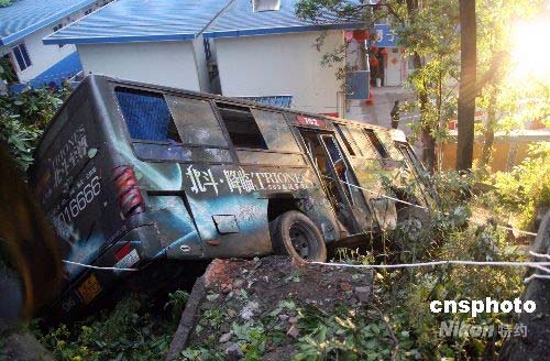 圖為事故公交車側(cè)翻在護(hù)坡上。中新社發(fā) 郭晉嘉 攝