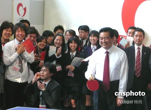 圖:胡錦濤在早稻田大學打乒乓 與日本青年交流